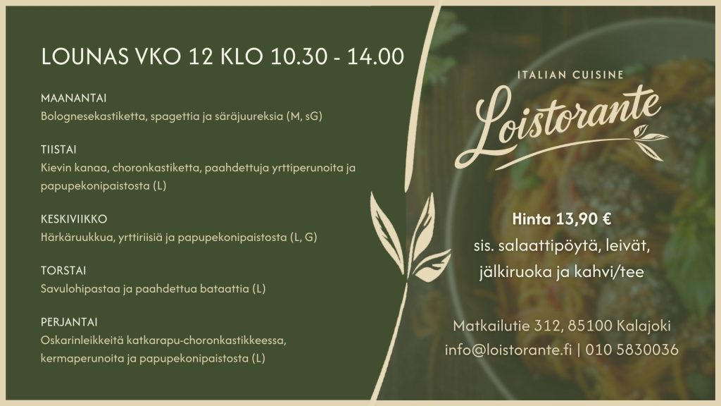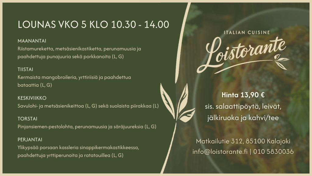 Vaihtuvan lämpimän ruoan lisäksi tarjolla on aina runsas salaattipöytä sekä leipiä levitteineen.