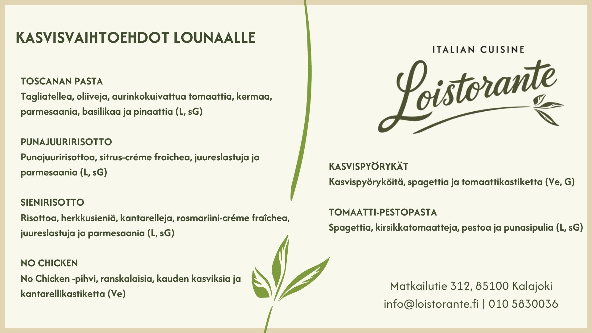 Ota hetki arjen kiireessä itsellesi ja pysähdy valmiin pöydän ääreen. Tarjolla Italialaisia makuja sekä paikallista lähiruokaa. Vaihtuvan lämpimän ruoan lisäksi runsas salaattipöytä sekä leivät levitteineen. Jälkimakeaa ja kahvia/teetä unohtamatta. Omat vaihtoehdot listalta myös kasvisruokailijoille!