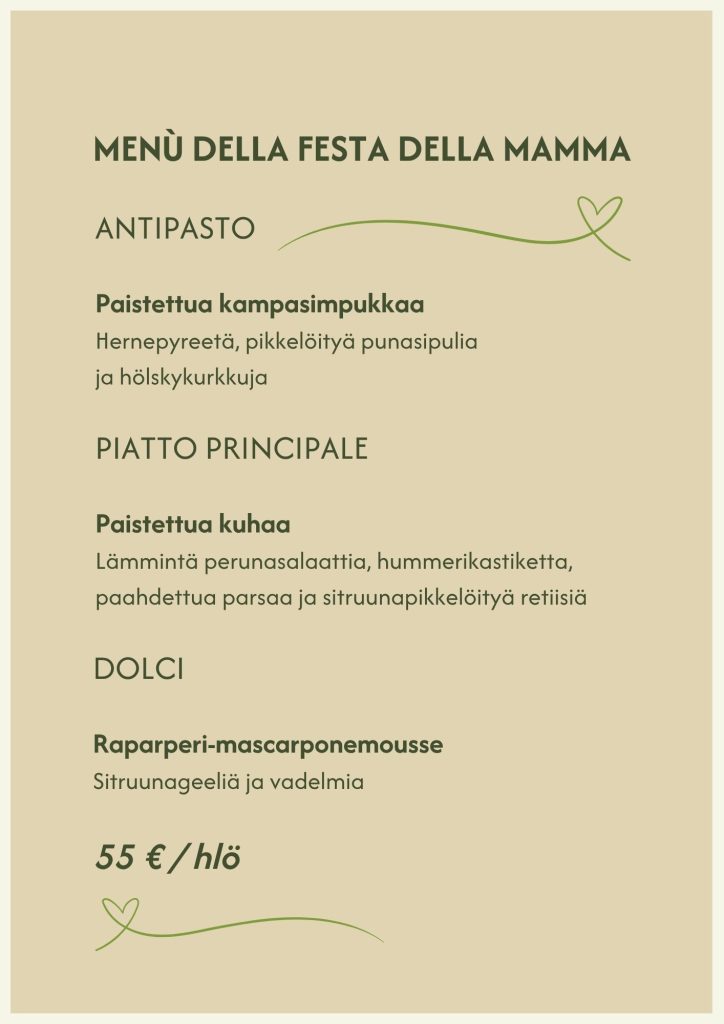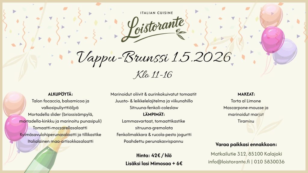 Vappubrunssi Loistorantessa Kalajoen Hiekkasärkillä perjantaina 1.5.2026 tarjoaa herkullisen ja rennon tavan juhlistaa kevään odotetuinta juhlapäivää. Runsas brunssipöytä koostuu tuoreista, sesongin mukaisista raaka-aineista sekä italialaisista mauista, jotka tekevät elämyksestä ainutlaatuisen. Kokoa ystävät ja perhe yhteen, nauti merellisestä tunnelmasta ja varaa paikkasi ajoissa – Vappubrunssi on yksi kevään suosituimmista tapahtumista.
